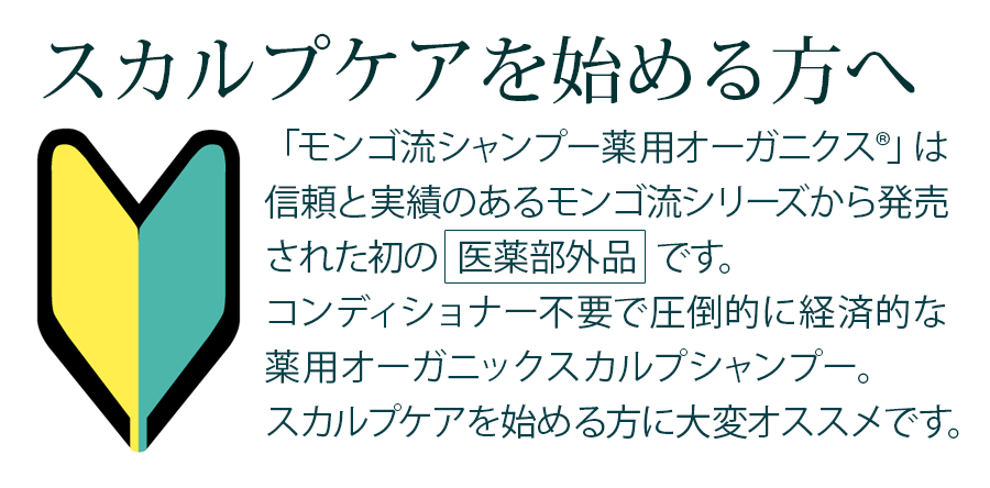 一般的にスカルプシャンプーは高いなと思っていた方でもモンゴ流シャンプー薬用オーガニクスをお使いいただくことでコストに関する不満は解消できるでしょう。また、自然派志向の方や、コンディショナーを使わない方へもオススメです。